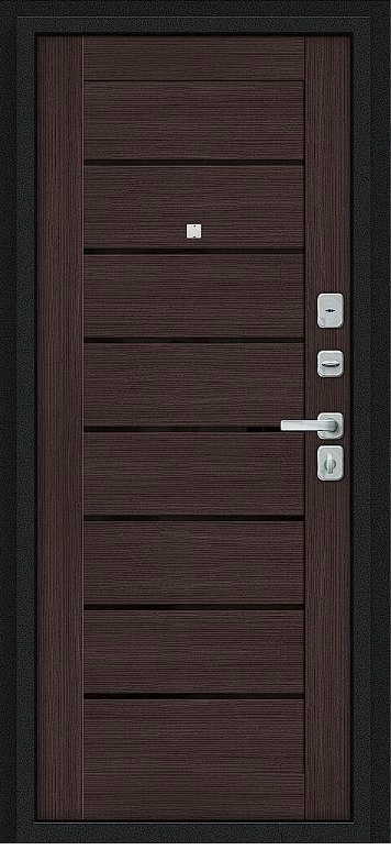 Надежная входная Дверь Браво Техно/BChrome Букле черное/Wenge Melinga премиум класса по цене 34 730 руб. Большая толщина стали защитит от проникновения в ваш дом, квартиру или коттедж. Используется очень качественная фурнитура: замки, цилиндры, ручки, защелки. Покрытие и отделка двери изготовлено под внимательным контролем производителя. Дверь имеет долгий срок службы и гарантию.